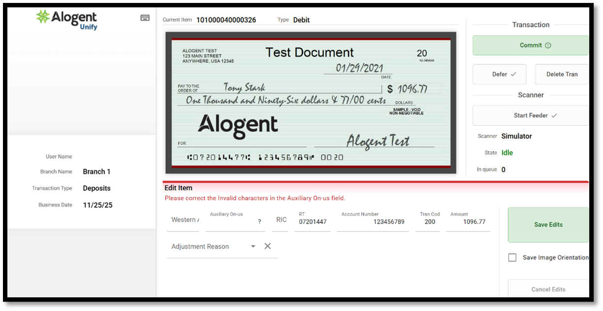 Step 2: Once each check image is captured and processed, Unify validates the item’s negotiability and compliance. This includes checking codeline field values against the institution’s configured business rules engine. Examples of potential exceptions include: