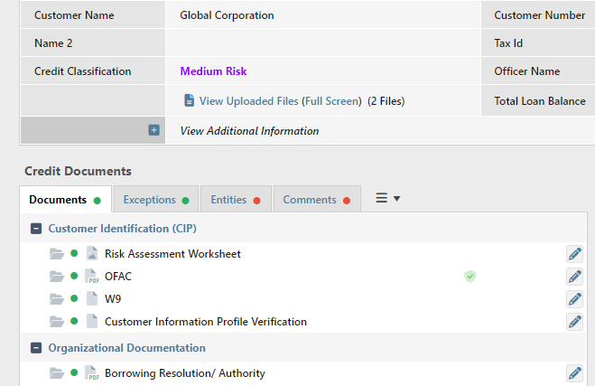 Example: Let’s assume that your financial institution requires OFAC (Office of Foreign Assets Control) documentation to go through a mandatory QC process. In this situation, you might create a document approval workflow for any new OFAC document that is added to AccuAccount. After an OFAC document has been reviewed and approved, AccuAccount will automatically remove the exception and display a green shield to indicate QC is complete.