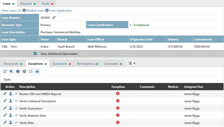Example: Let’s say that your post-closing review process includes ensuring guarantors are properly attached to the note, verifying that the collateral description is correct on the core, checking that the note’s maturity date and rate match the core, reviewing CRA and HMDA reports, and other important steps. Simply define all of these tasks ahead of time (as a task group) and then enable it on the appropriate customer page in AccuAccount. Tasks will appear automatically and can be assigned to specific team members. Staff can easily view and mark tasks as complete in AccuAccount.