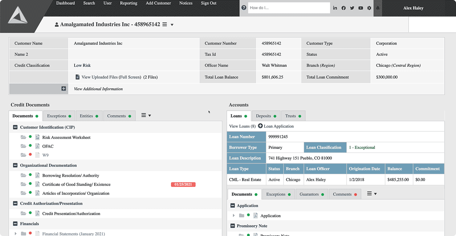 For example, let’s say that Mr. Thomas takes out a new loan to purchase a larger factory. Once Mr. Thomas’ loan is booked to the core, AccuAccount goes to work. Basic information about his new loan (such as the type of loan, loan number, balance, and origination date) is pulled into the system and merged with his existing profile.