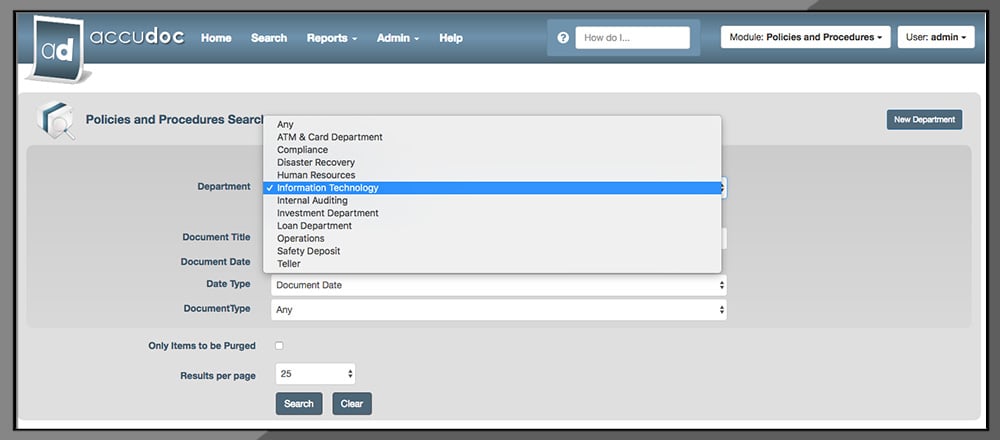 AccuDoc is an electronic document repository that offers a secure and scalable alternative to hard copy policy binders. AccuDoc’s modular approach delivers a centralized, searchable database of your bank or credit union’s policies and procedures. Each department can have its own section of the module, which accelerates the management of internal documentation.