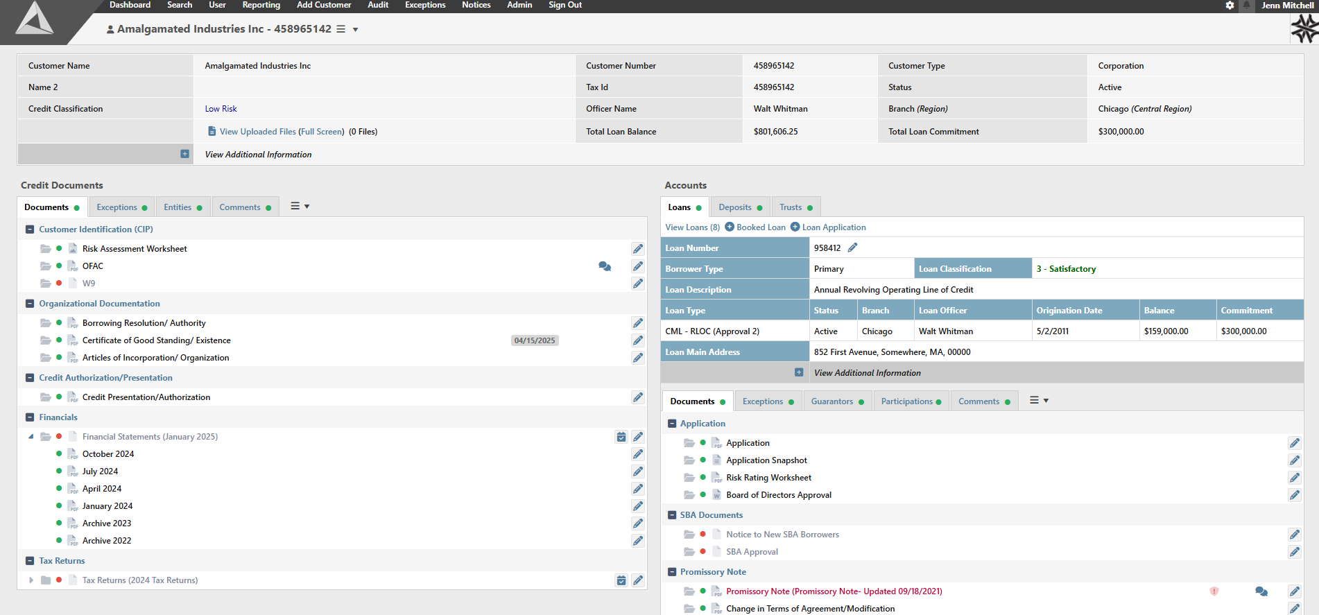 AccuAccount was designed to “look like” a traditional loan file. Credit information is located on the left side, while loans and accounts are accessible on the right. In addition, important relationship data from the core—such as identification numbers, total loan balance information, and total loan commitment—is conveniently visible at the top.
