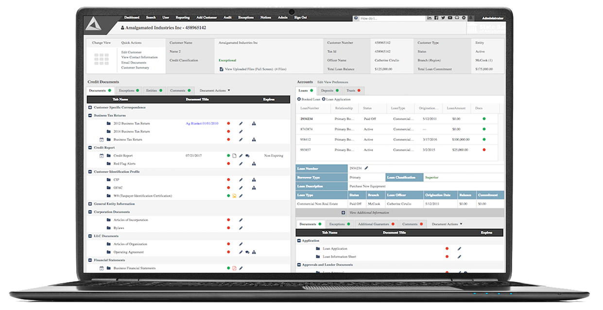 Loans and Collateral Information, including loan number, loan type, origination date, loan officer, as well as documentation and exceptions. AccuAccount also makes it easy to track cross-collateralized loans.
