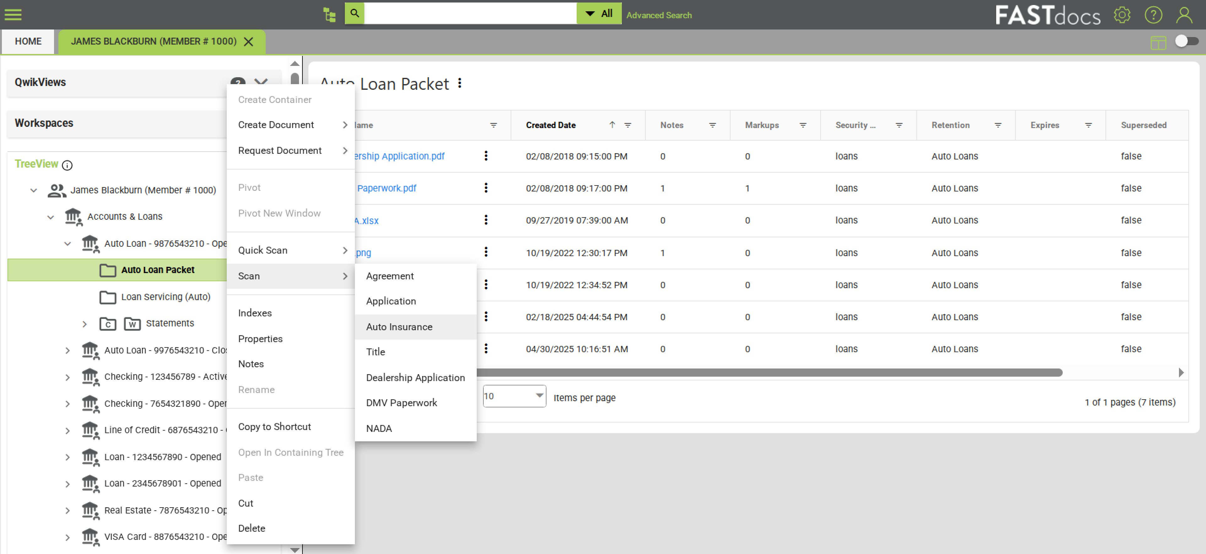Step 1: Locate the customer’s record and navigate to the correct directory in FASTdocs. In this case, drill down into the customer’s insurance-related documents.