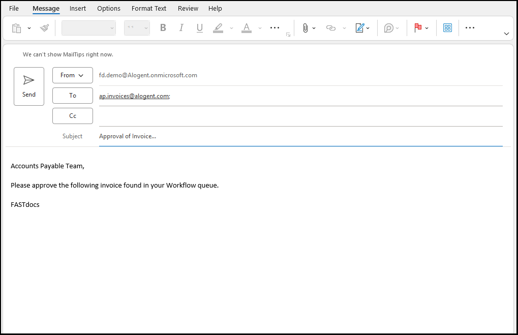 Step 1: The vendor emails a PDF invoice to your accounts payable team. Although FASTdocs supports a variety of imaging options, your AP team has a monitored inbox for invoices that automatically brings it into FASTdocs and places the invoice into the “vendor invoices” folder.