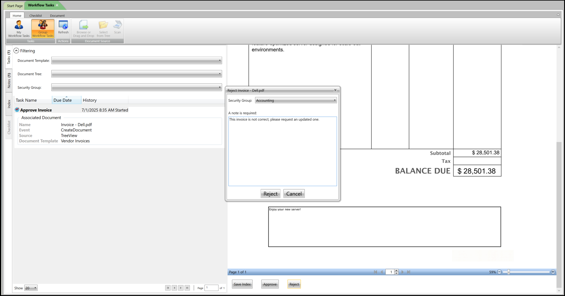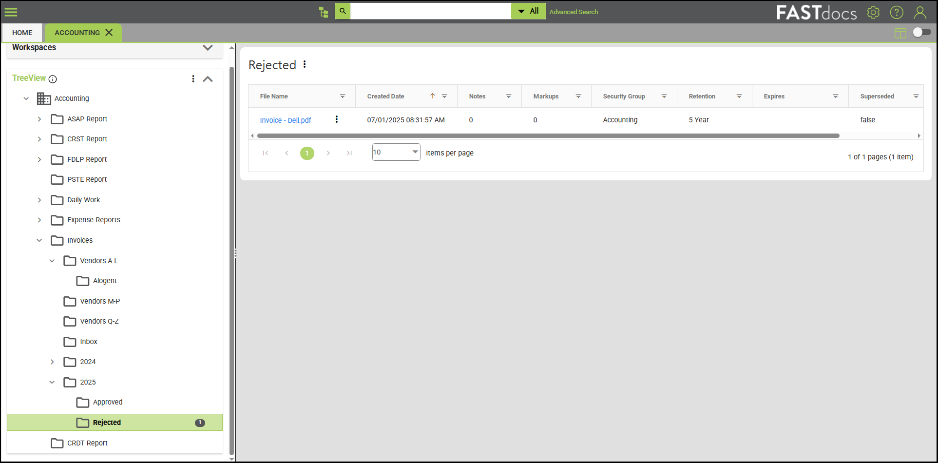 Step 3: An approver in the AP department reviews and approves the invoice. Since the $500 invoice amount falls within the AP department’s approval limit, FASTdocs automatically saves the document to the “approved” invoices folder.