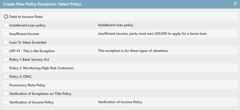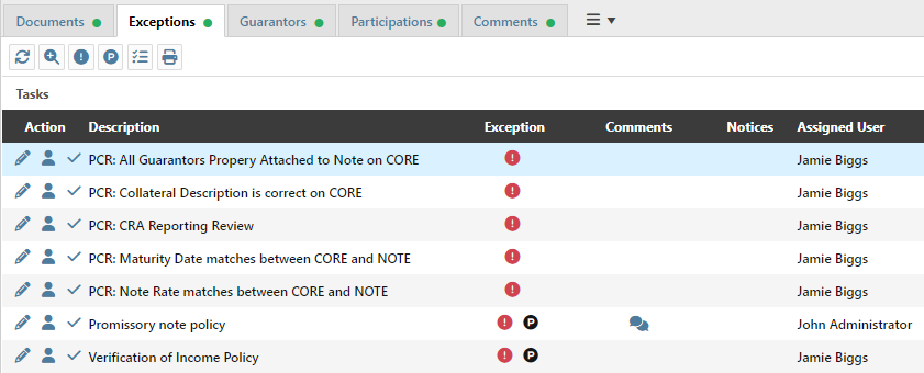 Step 3: Applying a policy exception adds a “P” icon to the loan’s record. In this example, policy exceptions have been applied for the promissory note and verification of income requirements.