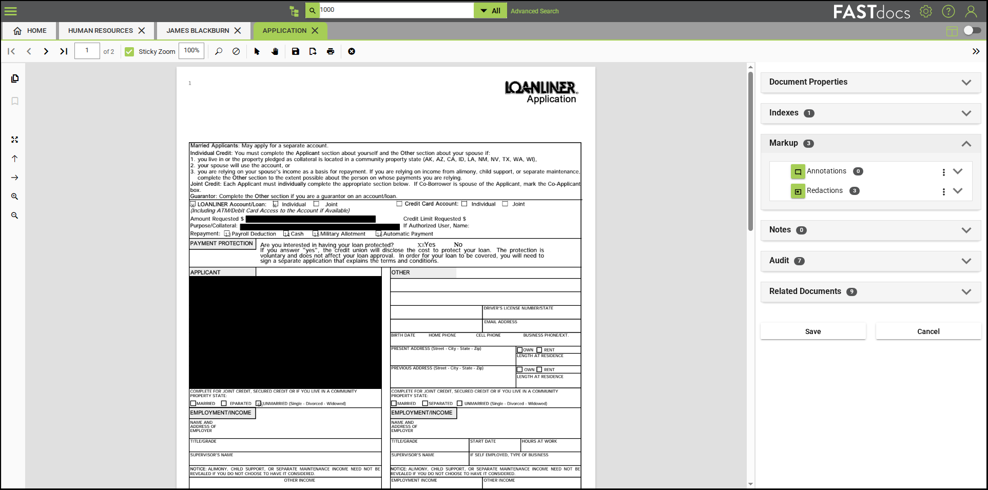 Access may be restricted at the document level in FASTdocs, such as employee performance evaluations that should only be seen by managers. Redacting information within documents offers additional control, such as when demographic information needs to be masked during the lending process.