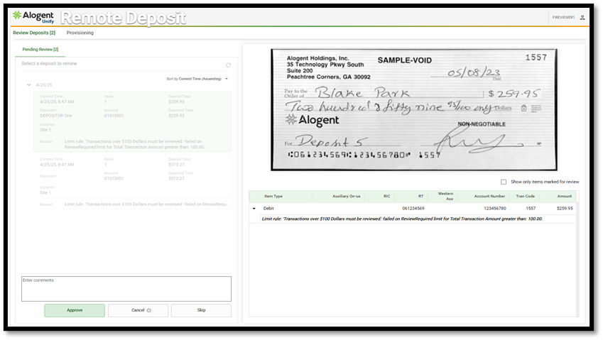 Step 3: Submitted items are assessed against pre-configured transaction limits. If a deposit exceeds customized thresholds, it can be flagged for review or automatically rejected based on the institution’s rules.