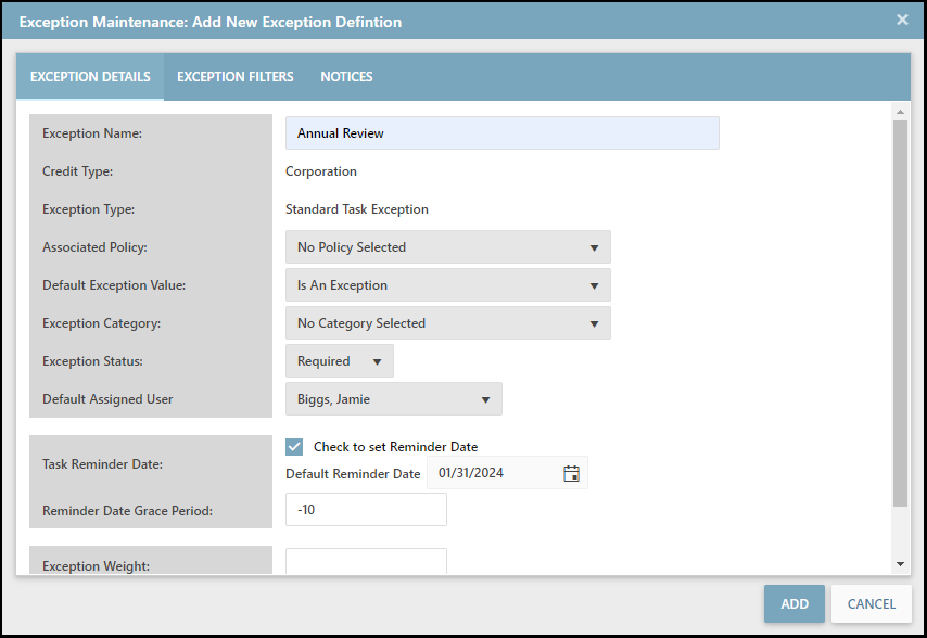 Task exceptions create accountability for one-off situations—such as remembering to complete annual reviews on ag loans—without handwritten to-do lists.