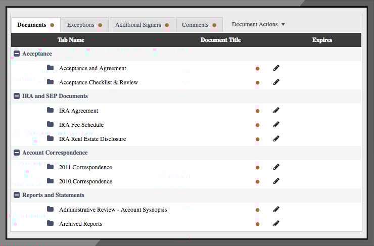 Reduce New Account Exceptions: In addition to reminding your team what to collect, AccuAccount also accommodates exception grace periods before documents start to appear in your exception reports. Once the allotted time has passed, AccuAccount will flag documents as exceptions and include them in your daily (or weekly) exception email reports. As trust documents are received, AccuAccount automatically clears the exception - eliminating the need to update spreadsheets or checklists.