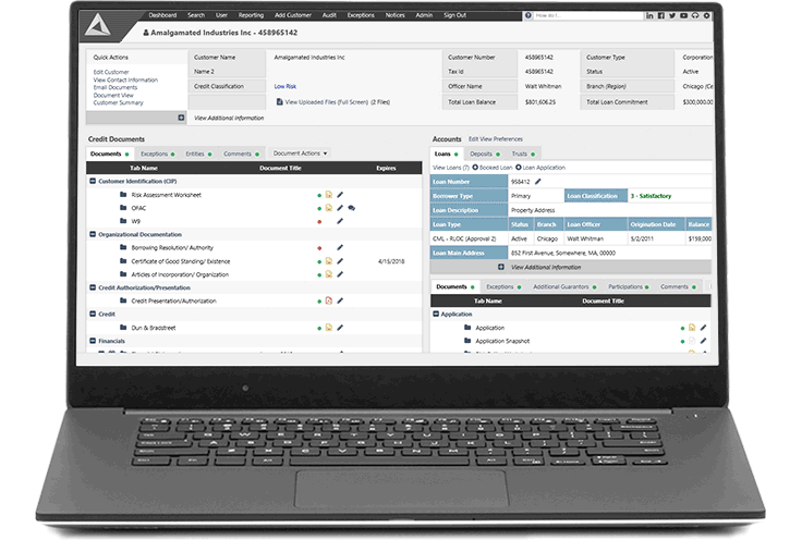 Easily manage cross collaterals and complex business relationships with intuitive access to documents, customer or member information, and related entities. Access timely credit, loan, and exception information from a visually intuitive interface that “looks like” a traditional loan file.