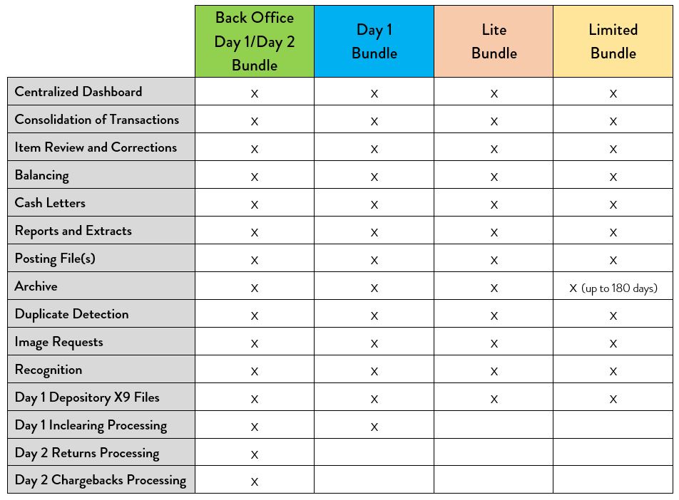 Unify Limited Bundle includes consolidation of transactions, item review and corrections, check image recognition, balancing, posting, archive limited to 180 days, duplicate detection, and Day 1 depository X9 files. Unify Limited Bundle also includes reports, exports and a centralized dashboard.